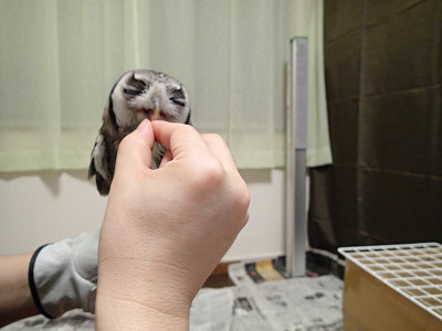 フクロウってご飯をたべるとき顔がしゅっとちいさくなりますが、虎鉄は、パックン貯金箱みたいな顔になります。若い人にはわからないかな?パックン貯金箱。検索、検索!