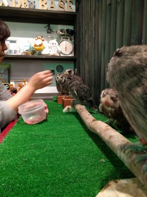 シロフクロウの六九蔵も、お店に来たばかりの頃は人からご飯をもらうのを嫌がり、置き餌も蹴散らかして食べないので、水に浮かべてみたり、足で踏ませてみたり、なんとか食べさせようと悩みの種でした。