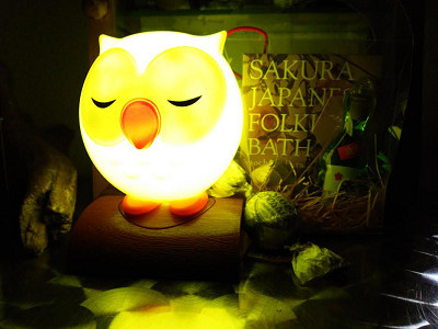 ふくろうさんランプ(左)と入浴剤(右)。